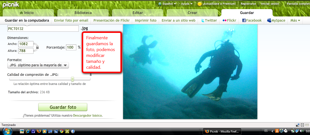 Picnik lo podemos encontrar en este enlace: http://www.picnik.com/app#/home/welcome, es un editor gratuito que no hace falta descargar en el ordenador y te permite hacer modificaciones en tus fotos como recortar, rotar, ojos rojos, brillo, color... También podemos modificar el tamaño de una foto, algo muy practico cuando nos encontramos fuera de casa y hay que mandar una foto muy pesado por correo electrónico.